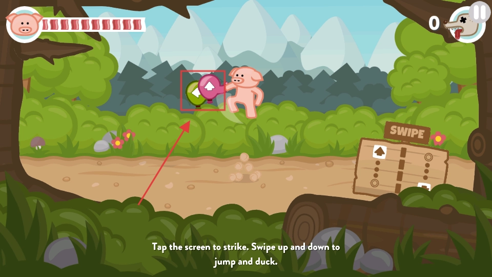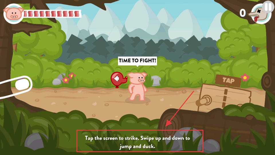 2、戰斗開始前,界面會提示【Tap】屏幕即可發起攻擊,上下滑動屏幕能控制小豬進行跳躍或下蹲動作,右側木板上也標注著【Tap】,以便玩家快速熟悉基礎操作。