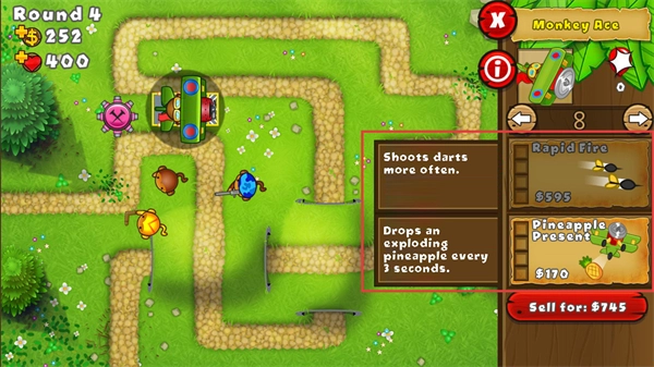 2、戰斗中合理選擇【RapidFire】或【PinelePresent】升級,提升飛機塔的攻擊頻率或爆炸傷害,有效抵御敵人。