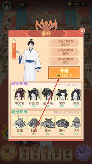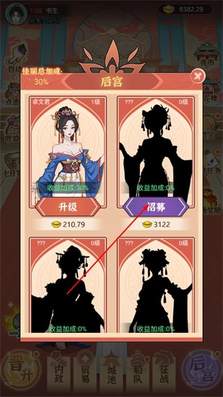 3、在后宮界面招募佳麗,升級佳麗可提升全局收益加成,進一步加快財富積累速度。