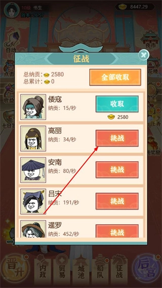 4、進入征戰(zhàn)界面后,可挑戰(zhàn)各類不同勢力,擊敗對應(yīng)勢力后能獲取持續(xù)的納貢收益;若使用功能,可直接領(lǐng)取納貢獎勵,以此助力身份逆襲進度的推進。