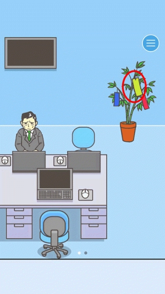 第三關的布局和第一關的布局一模一樣,只是我們第一場景多了盆植物以及領導消失了,這個時候如果去第一關的花盆那拿鑰匙那是行不通的,而老板也藏匿在那個柜子下面的空間內,這個時候最讓人值得懷疑的就是那盆植物,點擊植物上的黃色信條就發現鑰匙在里面,這個時候直接開門就行了。