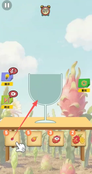 1、點擊屏幕下方的火龍果,把它拖拽到上方的杯子里就能完成基礎操作。