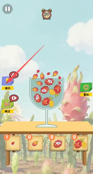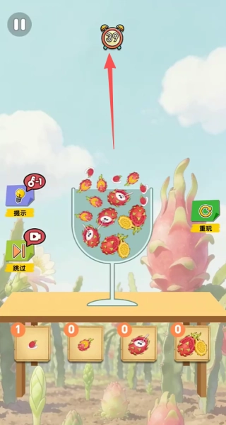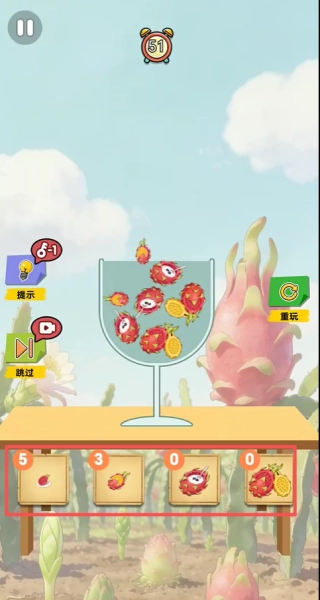 2、注意屏幕下方顯示的各種火龍果剩余數量,你需要將所有指定數量的火龍果都成功放入杯中。