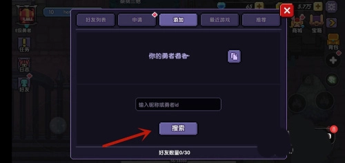 2、在好友系統中,你可以通過添加按鈕添加好友,只需知曉朋友的勇者ID或游戲名稱即可。同理,你也可以將自己的勇者ID或游戲名稱分享給好友。若你沒有朋友玩《我的勇者》也無需擔心,還有兩種添加好友的途徑:一是在好友系統的推薦列表中添加;二是若你近期參與過多人秘境模式,可添加隨機匹配到的隊友,只要對方接受邀請,你的好友列表就會新增一位好友。