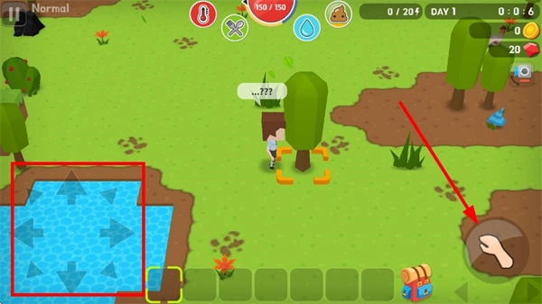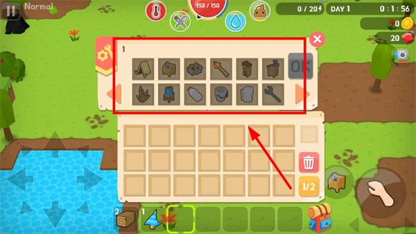 1、通過方向鍵操控角色移動,靠近樹木石塊等資源點,持續點擊右側按鈕獲取對應資源,資源會存入下方物品欄。