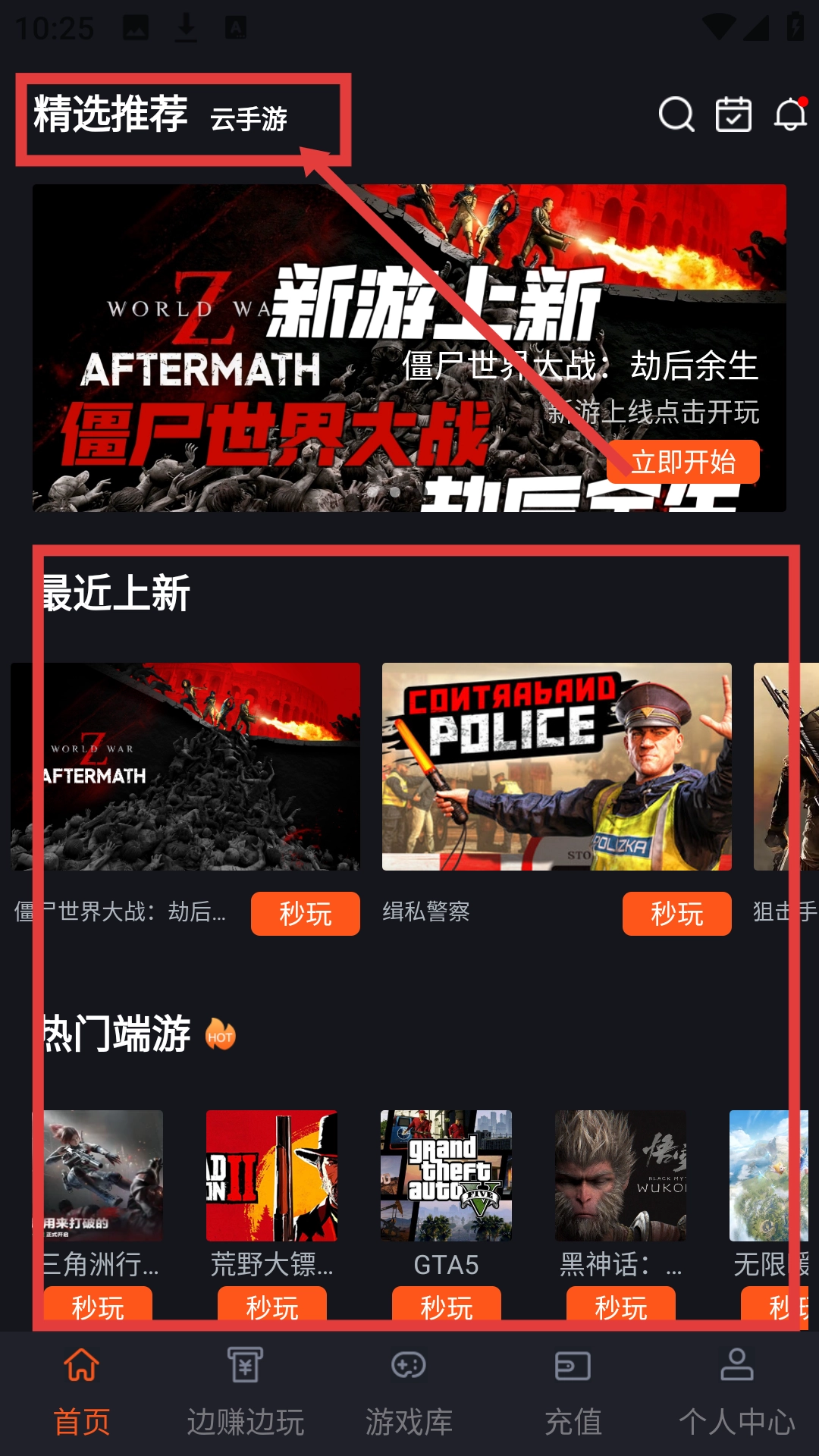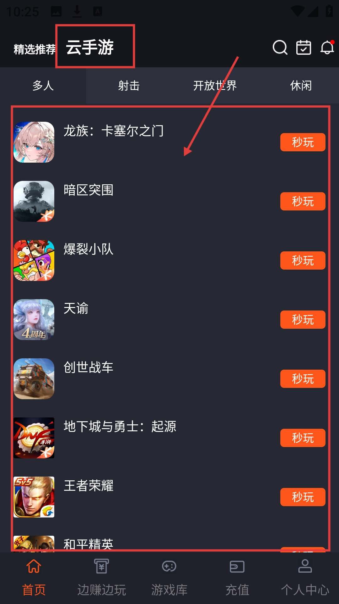 1、在首頁點擊【云】按鈕,即可進入云列表頁面,為選擇想要游玩的云游戲做準備。