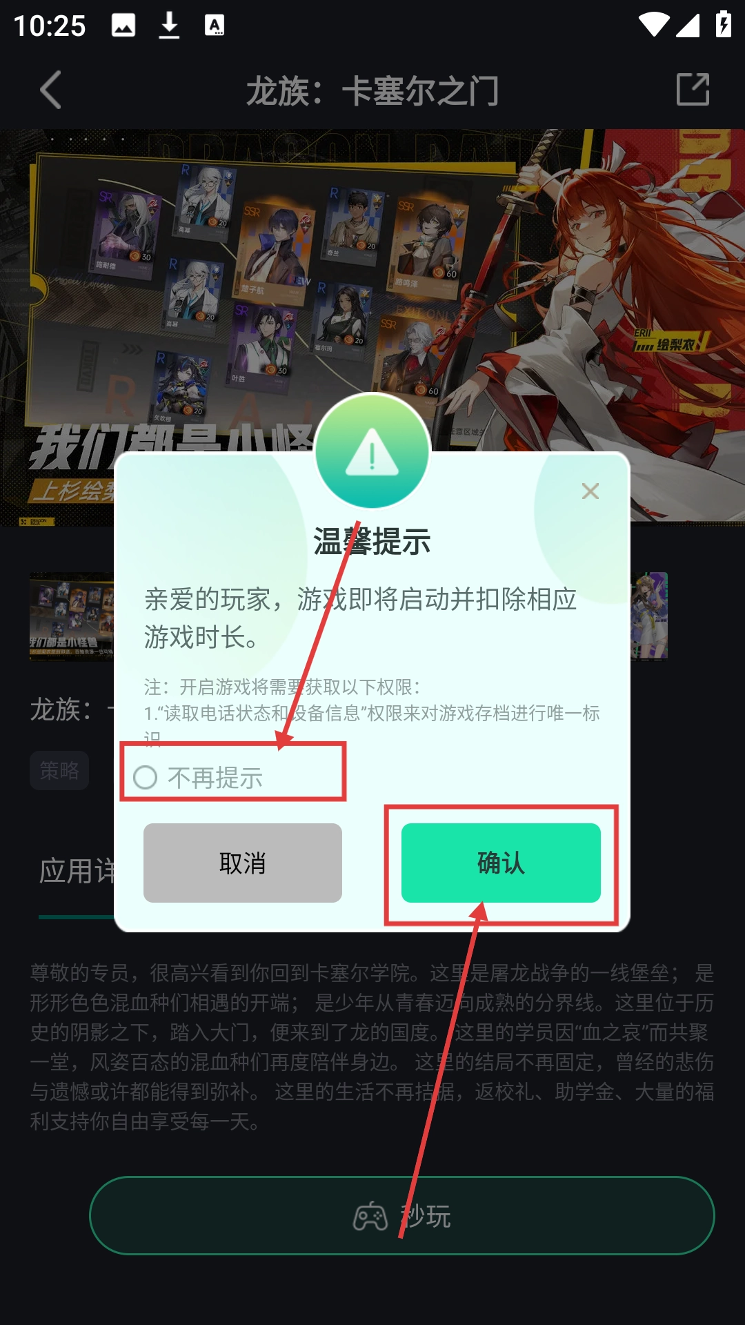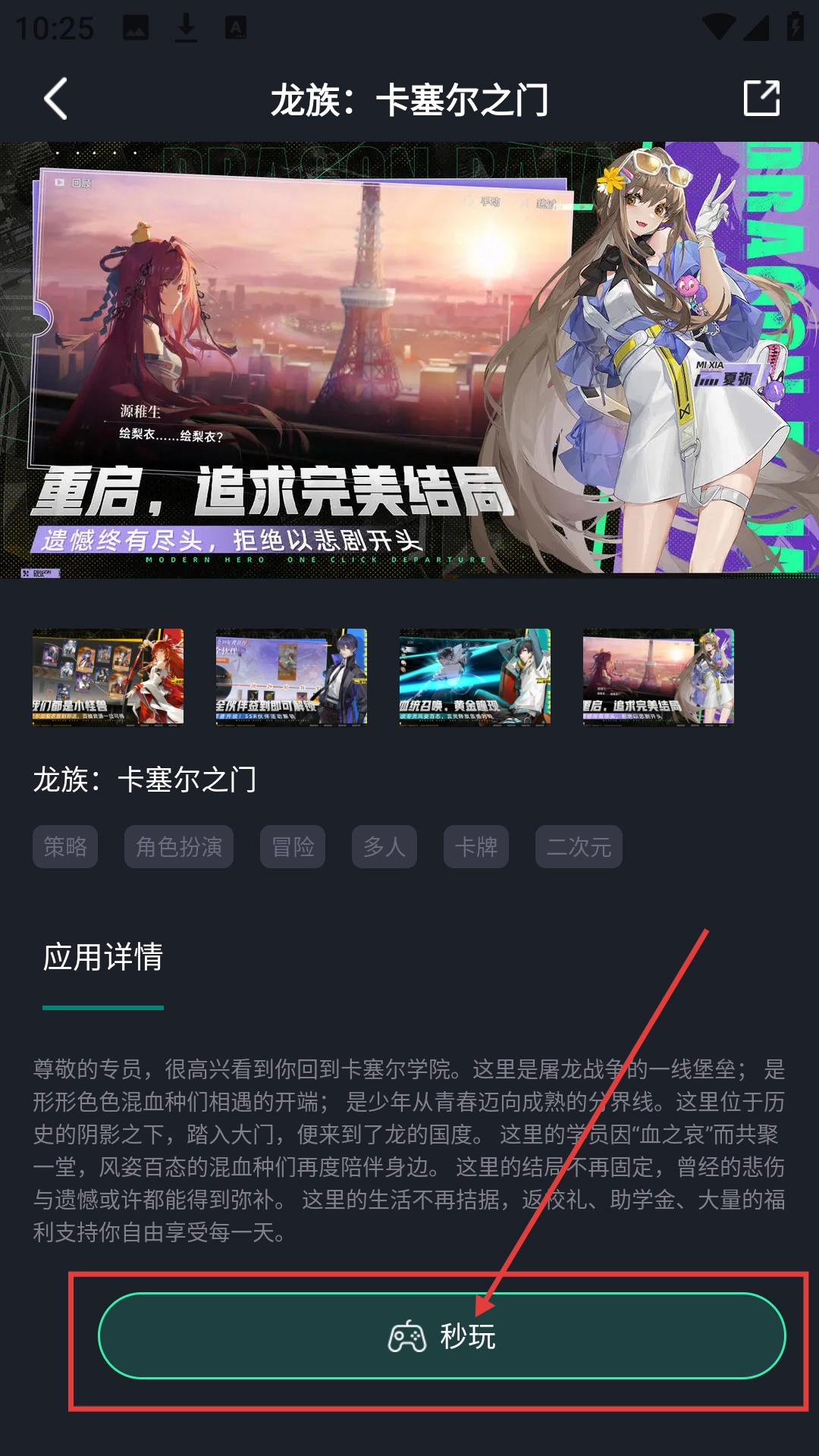 3、進入《龍族:卡塞爾之門》詳情頁后,點擊【秒玩】按鈕,就能觸發游戲啟動的溫馨提示了。