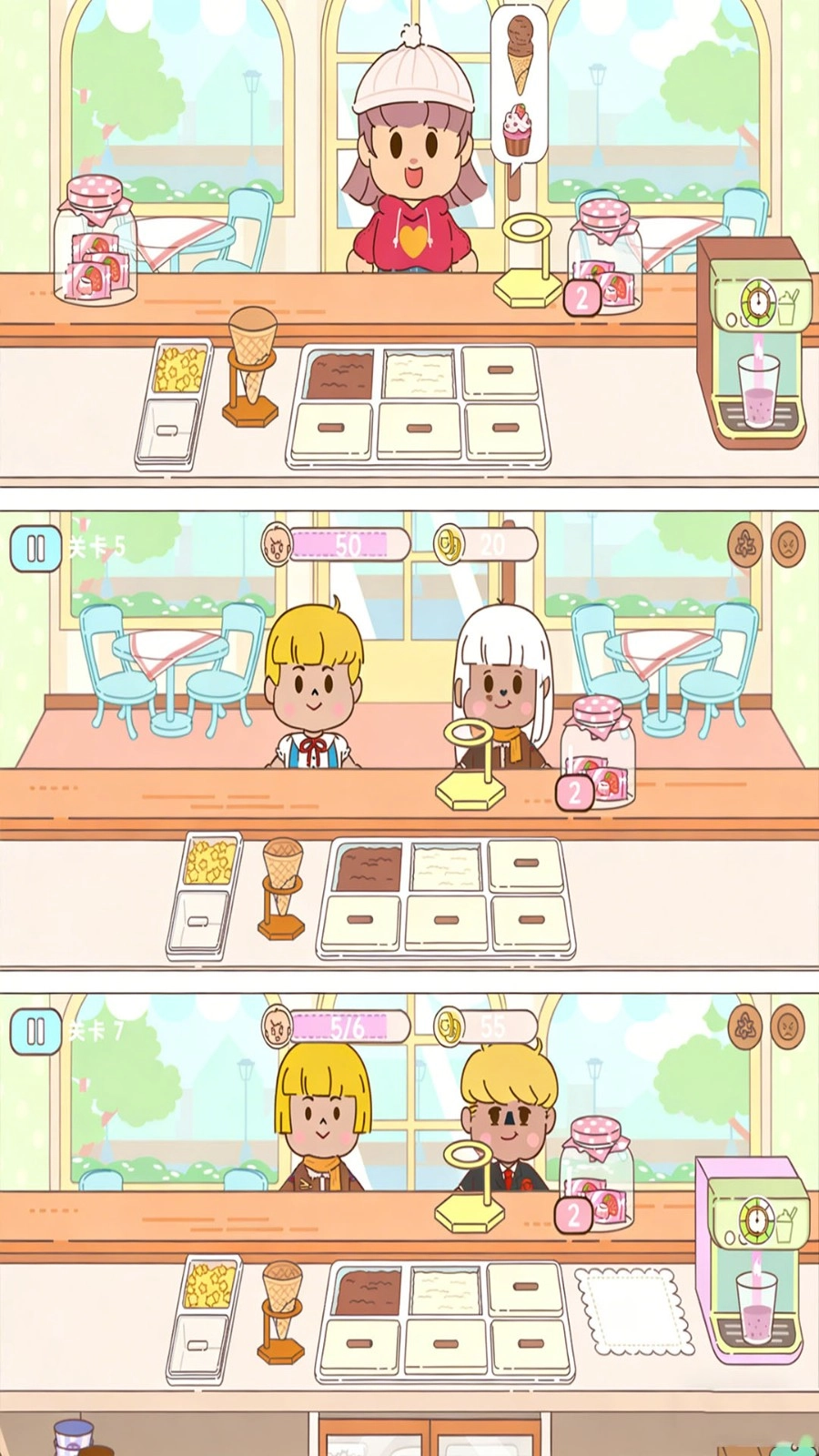 2、在有限時間內服務三位客人,根據客人的需求來制作冰淇淋,快速完成經營任務。
