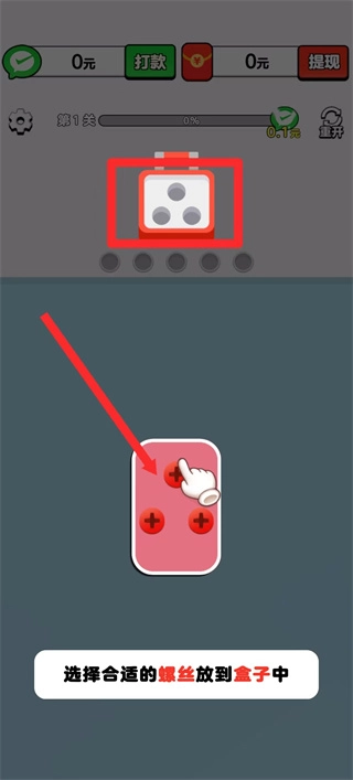 1、進入第1關后,點擊紅色箭頭指向的螺絲如紅色十字螺絲,將其放入對應顏色的盒子中,這是完成核心操作。