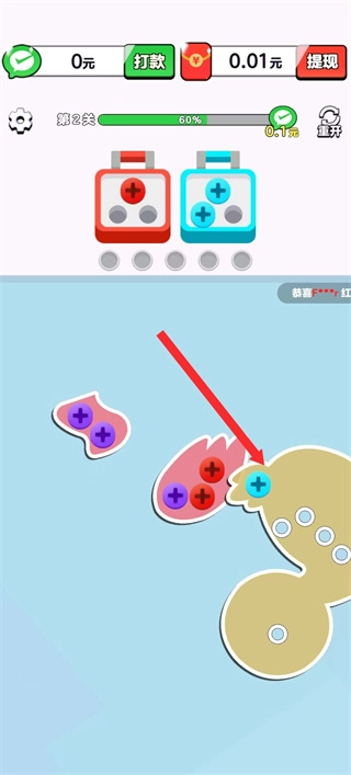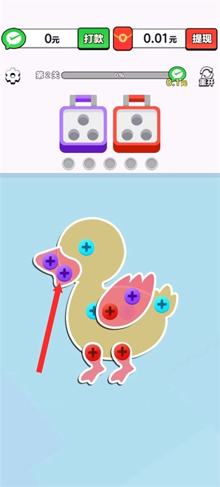 2、到第2關時,觀察目標盒子的顏色如紅色、藍色,點擊紅色箭頭指向的對應顏色螺絲,放入匹配的盒子。