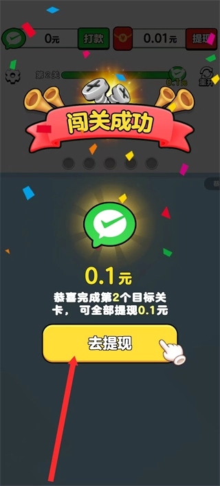 4、闖關成功后,點擊紅色箭頭指向的去提現按鈕,領取當前關卡的獎勵如0.1元,完成本次關卡流程。