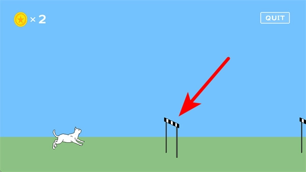 2、在跑酷場景中,依照紅色箭頭指引,操控貓咪向跨欄方向移動,準備完成跳躍障礙的操作。