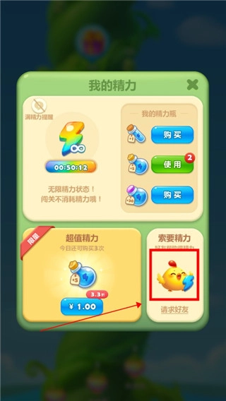 進入后就能看到精力會隨時間自動恢復,要是覺得恢復速度太慢,還可以用精力瓶直接補充。要是道具用完了,點擊右下角的“分享好友”按鈕,就能讓好友給你分享一些精力。