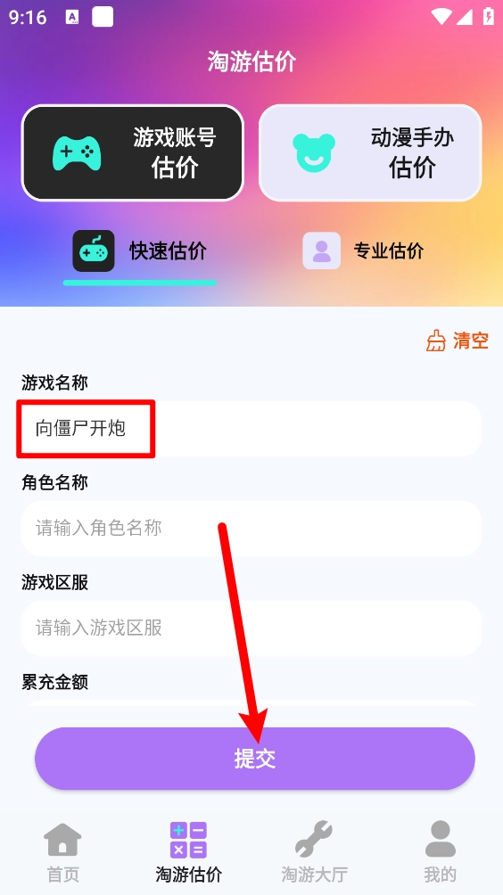 4、然后輸入游戲的角色名稱、區服、角色等級、道具等等,點擊"提交"就可以進行估號。
