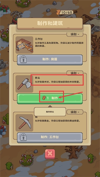 2、進(jìn)入【制作與建筑】界面,使用【1份木材】來制作【斧頭】,這個(gè)工具能夠用來收集木材,升級(jí)之后還可以增加木材的獲取數(shù)量。