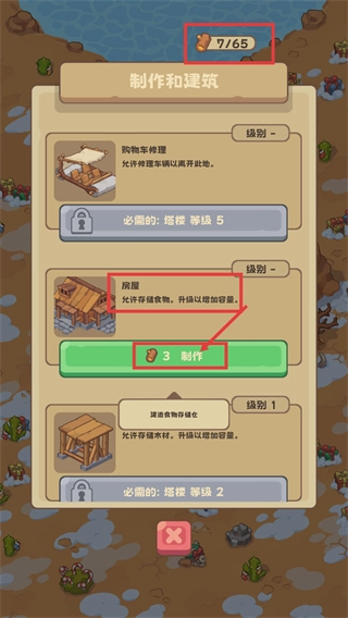 3、積累好資源后,消耗【3份木材】來制作【房屋】。房屋具備存儲(chǔ)食物的功能,通過升級(jí)還能進(jìn)一步擴(kuò)大存儲(chǔ)容量,從而增強(qiáng)生存保障能力。