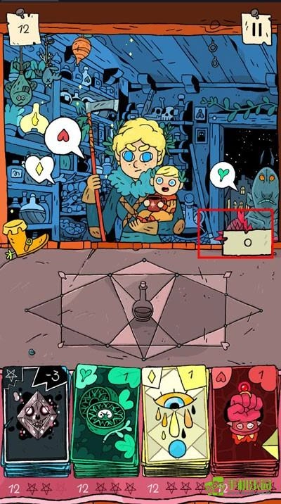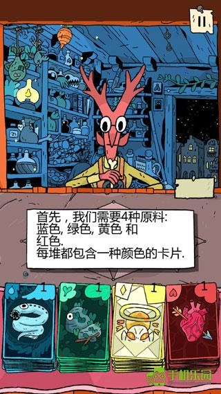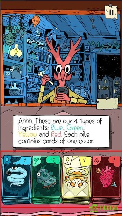 1、游戲中一共有藍色、綠色、黃色、紅色四種類型的成分,組合四種成分的卡牌就能創造需要的魔藥