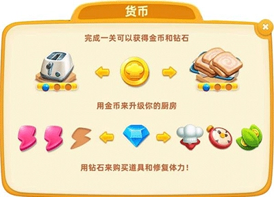 1、金幣:完成關卡可以獲得本關產出的金幣(雙倍加成道具、連擊均可以提高金幣的產出);金幣用于升級設備和食材。