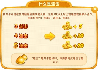 連擊要求大廚在關卡中連續完成顧客所需求的食物,連續上菜達到3次以上時出現連擊并可獲得額外金幣(兩次及以下不計算連擊)。最高連擊為5連擊,可額外增加20金幣。
