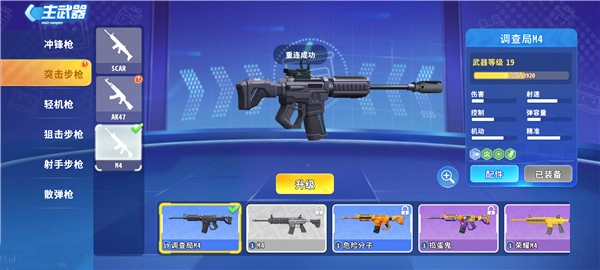 在槍戰精英中,武器多樣。沖鋒槍有MP5和野牛兩類,我比較喜歡野牛,因為傷害和彈容量比MP5要好。突擊步槍有SCAR、AK47和M4,體驗下來感覺M4最猛,射速高傷害也高。