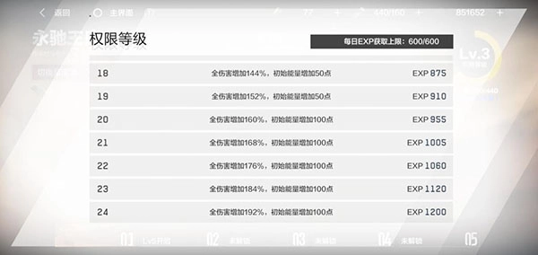 永馳王座副本沒有采用通關章節的機制,而是以“權限等級”作為解鎖章節的獨立條件。玩家通過小章節時可獲取權限經驗,該副本共有5個大章節,需依次提升5個權限等級才能解鎖下一章節。權限等級提升后會獲得BUFF強化效果,且每日獲取的等級經驗存在上限。