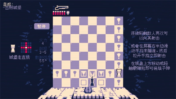 沿用國際象棋棋子移動規(guī)則,國王保留經(jīng)典走位限制,可對特定范圍內(nèi)的白棋發(fā)動攻擊,射擊后必須移動角色完成裝彈,攻防博弈充滿獨特的戰(zhàn)術(shù)性。