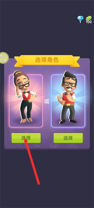 進入角色選擇界面后,點擊紅色箭頭所指的選擇按鈕,確認選用該角色啟動游戲,此為進入操作的步驟。