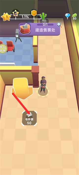 2、在影院場景里,按照紅色箭頭的提示,點擊標有“電影票50”的交互區域,就能推動建造售票處的任務進度。