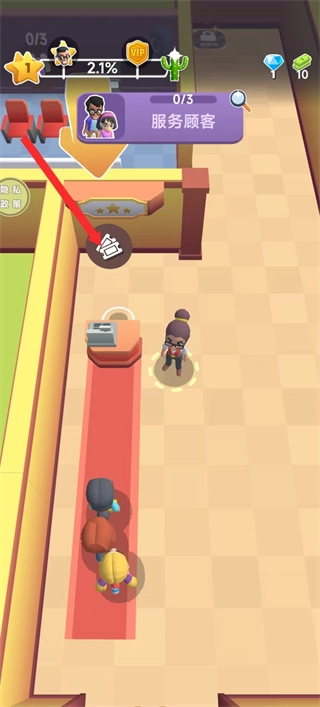 3、跟隨紅色箭頭提示,點擊服務臺區域,完成服務顧客的任務要求,提升關卡進度與星級。