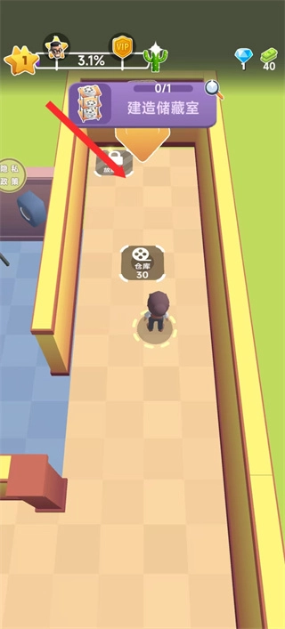 4、任務推進后,按照紅色箭頭的指引,點擊相應的交互區域,消耗資源來推進儲藏室的建造任務。