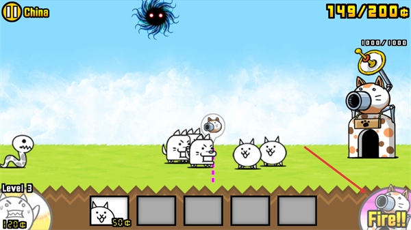2、界面上方能量條攢滿后,點(diǎn)擊右側(cè)Fire使用貓咪炮清理密集小怪。