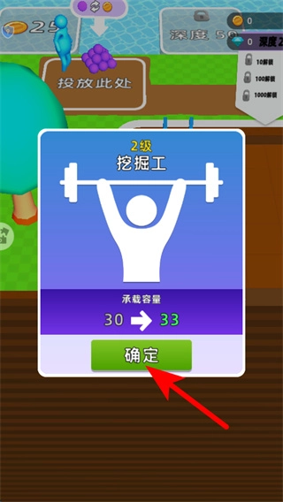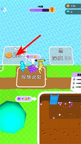 4、當角色完成當前深度的挖掘后,依照紅色箭頭指引,將角色再次投放到投放此處區域,重復挖掘流程以積累資源。