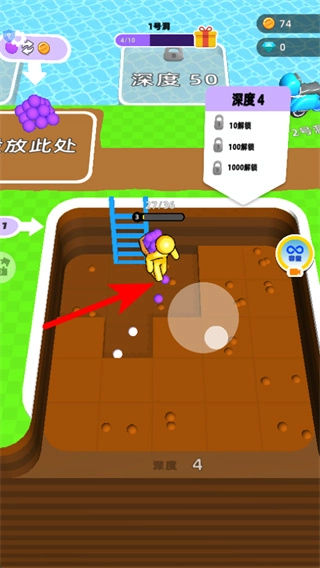 2、游戲里跟著紅色箭頭的指示走,操控角色往下挖泥土,讓洞穴的深度不斷增加,與此同時收集挖掘時碰到的各種資源。