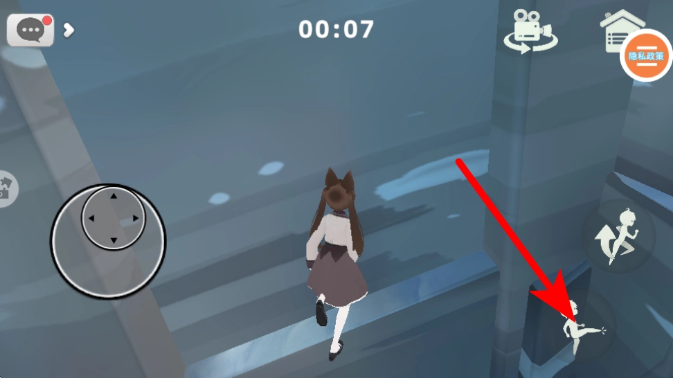 1、在室內場景里,按照紅色箭頭的指示,通過操作左側搖桿來控制角色移動,朝著場景中的互動區域(比如角落)行進,以此探索場景的相關內容。
