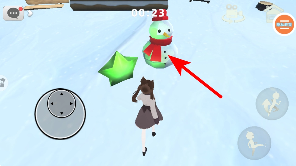 進入雪地場景后,按照紅色箭頭的指引前進,操控角色靠近雪人等目標物品,完成場景中的互動任務,以此積累探索進度。