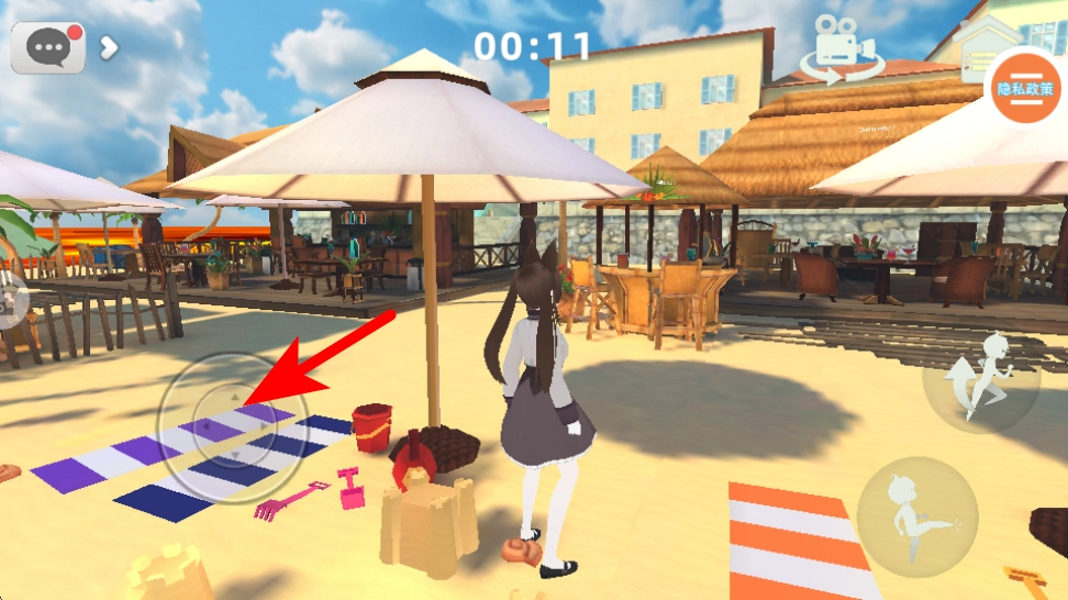3、切換到沙灘場景時,依照紅色箭頭指引,通過搖桿調整角色位置,靠近場景內的道具如沙具,收集道具推進玩法。