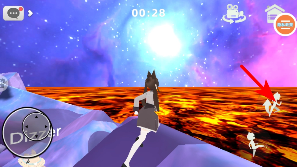 4、進入星空巖漿場景后,按照紅色箭頭的指引前進,通過操作移動按鈕來控制角色避開巖漿區域,朝著安全的平臺移動,從而完成目標。