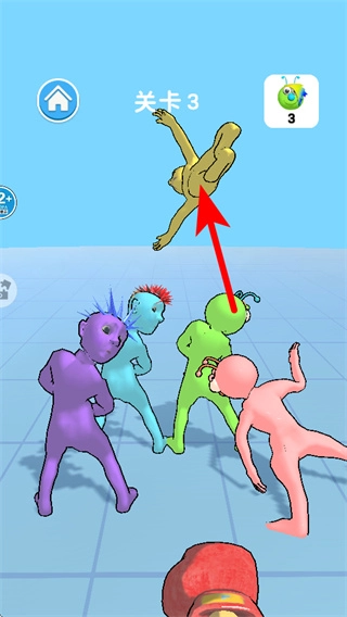 4、進入新關卡后,再次依照紅色箭頭指引,瞄準新的目標角色如空中的黃色角色發起攻擊,完成擊打目標。