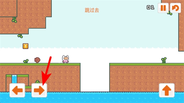 2、游戲中依照紅色箭頭指引,操作右側按鈕控制角色向右移動,靠近場景中的平臺缺口,為跳躍操作做準備。
