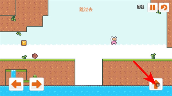 3、緊跟紅色箭頭指引,點擊向上按鈕控制角色跳躍,越過平臺之間的缺口,到達右側的安全平臺,推進關卡進度。