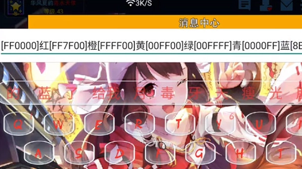 4、這里只要在字面前加入相對應的顏色代碼,就可以打出相對應的字體,比如打出一個紅色的“紅”字,那么就在前面加[FF0000](其余類推),如下圖所示: