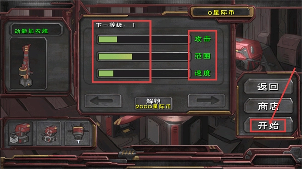 1.戰前部署:首先在軍備庫中查看如【動能加農炮】等武器的【攻擊】、【范圍】、【速度】屬性。解鎖需消耗【2000星際幣】,確認配置后點擊【開始】進入實戰關卡。