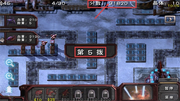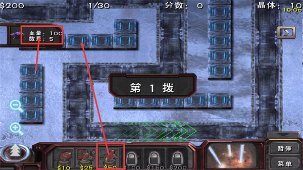 2.初期接敵:進入第1波戰斗,情報顯示敵方為【血量:100-數量:5】的單位。立即在蟲族行進路徑旁部署炮塔(例如初始的$50級炮塔),建立第一道攔截火力網。