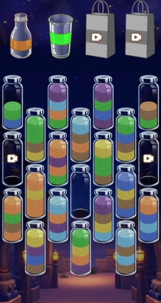 4、進入操作界面后,你會發現幾個裝有不同顏色液體(或沙子)的瓶子,游戲目標是借助傾倒操作,把相同顏色的液體全部歸類到同一個瓶子中。