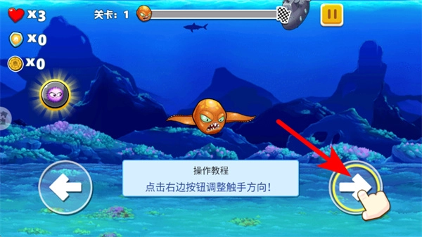進入關卡后,按照紅色箭頭的提示,點擊右側按鈕來調整觸手的朝向,對準橙色怪物這類敵方目標,為發起攻擊做好準備。