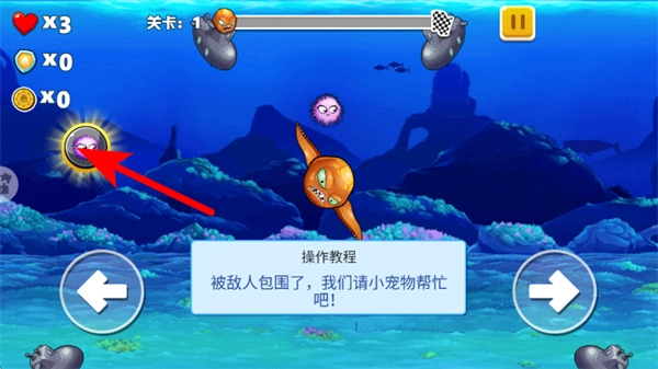3、要是被敵人包圍了,就按照紅色箭頭的提示,點擊左邊的寵物圖標來召喚寵物協助作戰,輔助我們擊敗敵方目標,從而推進關卡的進度。
