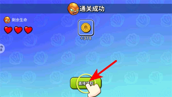 4、完成關卡通關后,按照界面上紅色箭頭的指引操作,點擊“直接領取”按鈕就能獲得金幣等通關獎勵,把這些資源積累起來可以用于后續關卡的實力提升。
