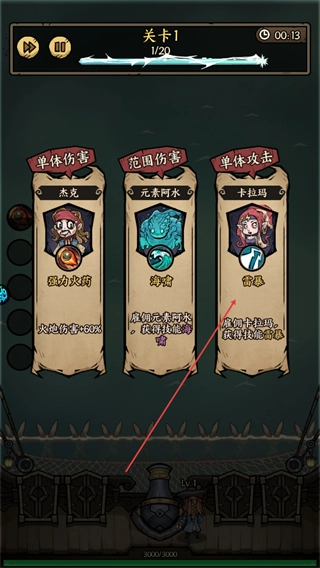 1、在關(guān)卡1界面挑選杰克、元素阿水、卡拉瑪?shù)瘸鰬?zhàn)角色,完成上陣陣容的配置。