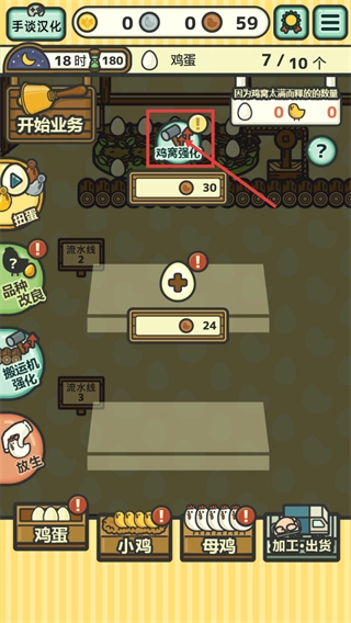 是一款畫風(fēng)治愈的卡通模擬經(jīng)營,聚焦養(yǎng)雞工廠的全鏈條運(yùn)營,從雞蛋孵化、雛雞成長到成雞產(chǎn)蛋、成品加工,每個(gè)環(huán)節(jié)都需玩家親力規(guī)劃。作為新任廠長,核心目標(biāo)是通過科學(xué)經(jīng)營實(shí)現(xiàn)收益增長,手動(dòng)點(diǎn)擊加速機(jī)制讓生產(chǎn)節(jié)奏可控,獨(dú)特的晝夜循環(huán)系統(tǒng)劃分生產(chǎn)與升級(jí)階段,搭配多樣經(jīng)營策略,帶來沉浸式且充滿趣味的工廠管理體驗(yàn)。1、當(dāng)積累【7到10個(gè)雞蛋】后,消耗【30】資源執(zhí)行【雞窩強(qiáng)化】操作,能夠增強(qiáng)雞窩的承載能力并提高其產(chǎn)出效率。
