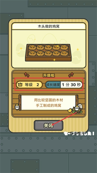 3、雞窩升級(jí)到【等級(jí)-2】后,成長速度調(diào)整為【1分30秒】,雞窩材質(zhì)會(huì)更堅(jiān)固,有助于提高后續(xù)的產(chǎn)出效率。